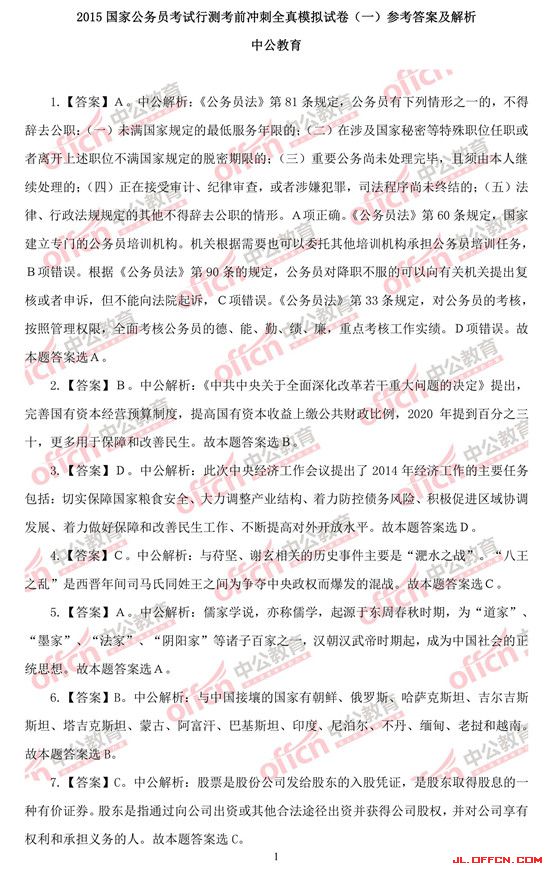 2015国家公务员考试行测考前冲刺全真模拟试卷(一)参考答案及解析