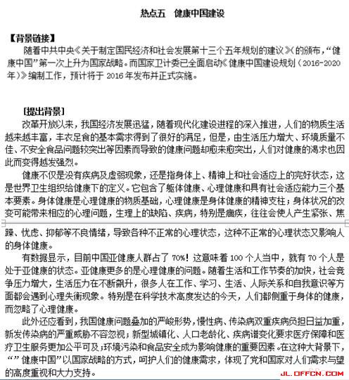 热点五 健康中国主题,不仅从身体健康方面进行了分析,在对策部分第六条,还从健康行为、健康素养这个层面提出了对策,这与考试的主题不谋而合。
