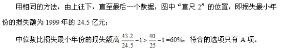 我们用直尺垂直于条形从上往下比,当数到高于直尺的条形有五个时停住,看图中“直尺1”的位置,中位数为2006年的43.2亿元;
