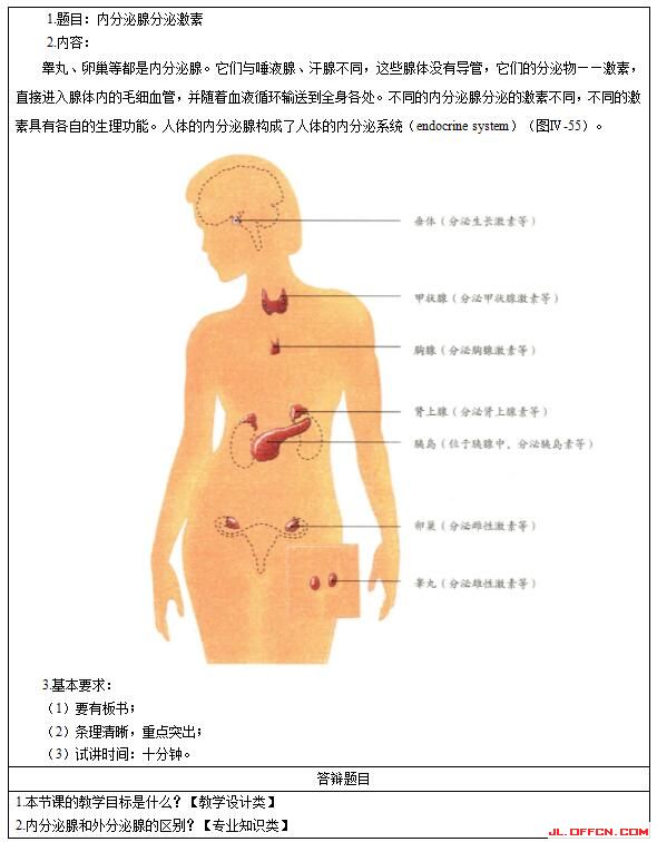 请一位学生到讲台,指出自己身体上内分泌腺的大致位置,并说出分泌激素的名称。
