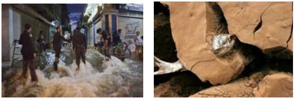 【导入新课】利用多媒体展示有关泰国洪水、云南大旱的图片。包括受灾现状、救灾情况。读图片让学生感受到“大量的洪水没办法利用,许多地方又严重缺水”。由此引入课题:水资源的利用和保护。