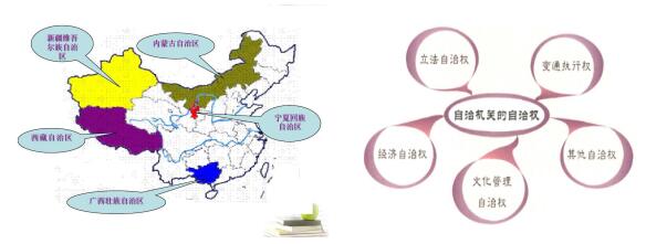 教师:大家在图一上可以清晰看到五个少数民族自治区的位置,请同学们想想这些地区都有什么特点呢?除了自治区,你还知道其他一些行政单位名称吗?图二是自治机关的自治权的五种类型,你能举出几个实际的例子吗?学生分组讨论思考并回答。