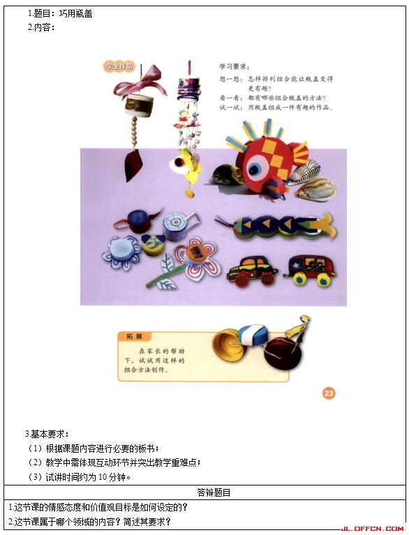 教师展示用瓶盖制作的各式各样卡通形象,提出问题:你都认识它们么?主要用什么材料制作的?师生交流,引出课题——《巧用瓶盖》。