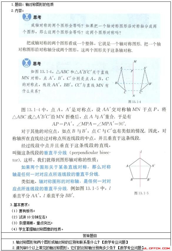 初中数学《轴对称图形的性质》主要教学过程及板书设计