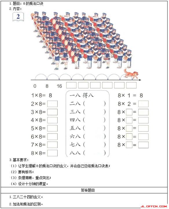 (1)创编口诀:1个8是8,2个8相加是16。我们除了可以用加法算,还可以用什么方法呢?(乘法计算)