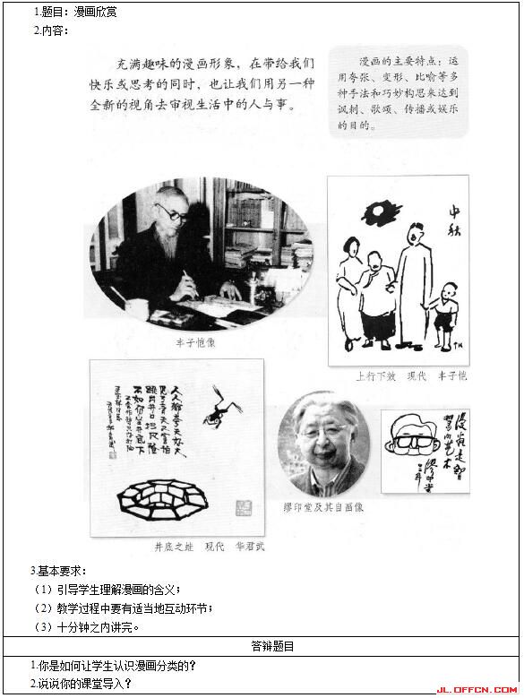 老师拿出一些名人漫画形象图片并设问:同学们能猜出这些人物是谁吗?能说出这是哪一种艺术形式吗?
