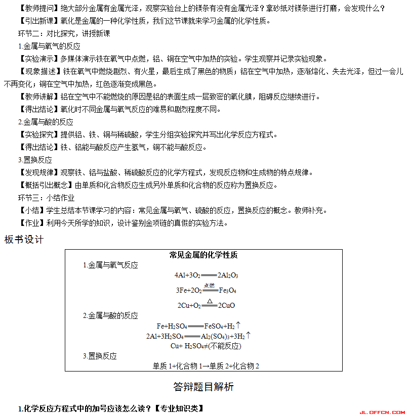 重点:金属的活动性顺序及置换反应。因为金属的活动性顺序是中学化学学习比较重要的一个规律,与后面要学习的置换反应直接相关,是将要学习的金属性、原电池正负极判断等知识的基础。