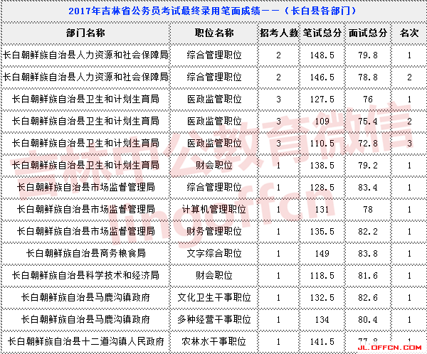 2017年吉林省公务员考试最终录用笔面成绩——(长白县各部门)