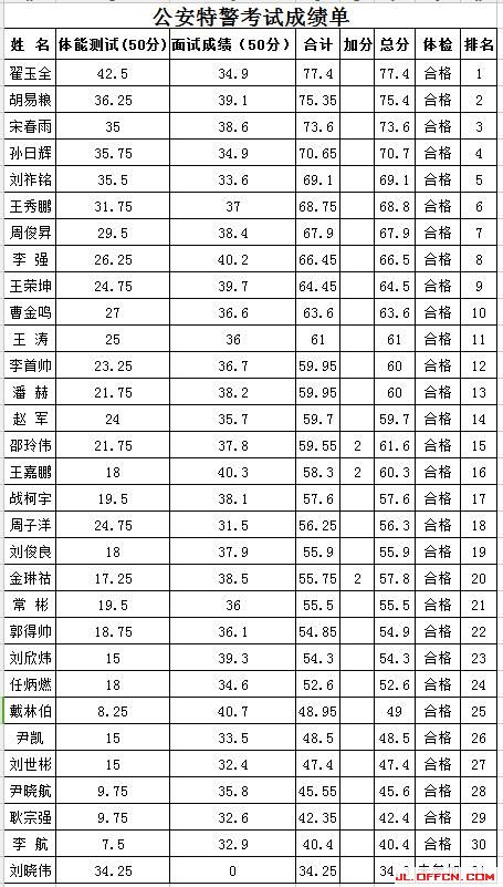 2017长白县公安局招聘招聘勤务特警及文职综合成绩