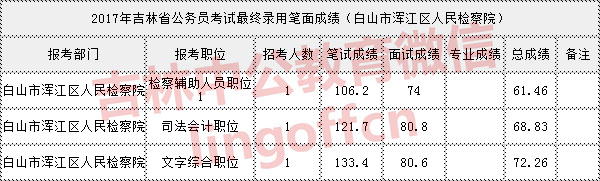 2018年吉林省公务员考试进入面试最低笔试成绩是多少?最终公务员录用笔试面试成绩是多少?吉林公务员考试分数线是多少?针对这些疑问吉林中公教育为广大考生汇总整理了2017年吉林省公务员考试最终录用笔试面试成绩信息汇总。本文为广告考生提供(白山市浑江区人民检察院)2017年吉林省考最终录用笔试面试成绩。