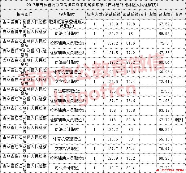 2018年吉林省公务员考试进入面试最低笔试成绩是多少?最终公务员录用笔试面试成绩是多少?吉林公务员考试分数线是多少?针对这些疑问吉林中公教育为广大考生汇总整理了2017年吉林省公务员考试最终录用笔试面试成绩信息汇总。本文为广告考生提供(吉林省各地林区人民检察院)2017年吉林省考最终录用笔试面试成绩。