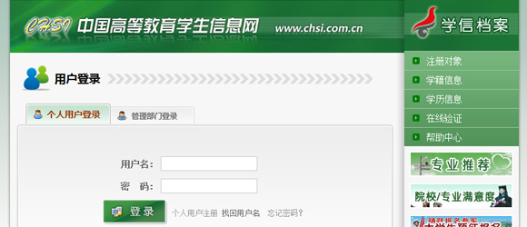 第二步,进入学信档案登录页面,用用户名和密码登录。如还未注册,请点击“个人用户注册”注册帐号。