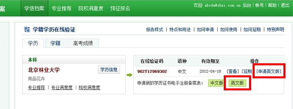 第八步,点击“English”查看英文版学历证书电子注册备案表。