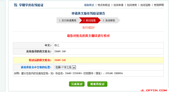 [page]第五步,支付完成后,进入信息核对页面。如果名字是多音字,选择正确的拼音,如果姓是复姓或者多个汉字,请选择姓和名之间空格的位置,然后确认提交,待系统审核。