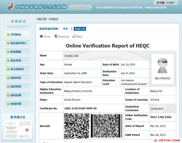 第六步,学历证书电子注册备案表申请完成,点击“确定”按钮回到在线验证栏目。