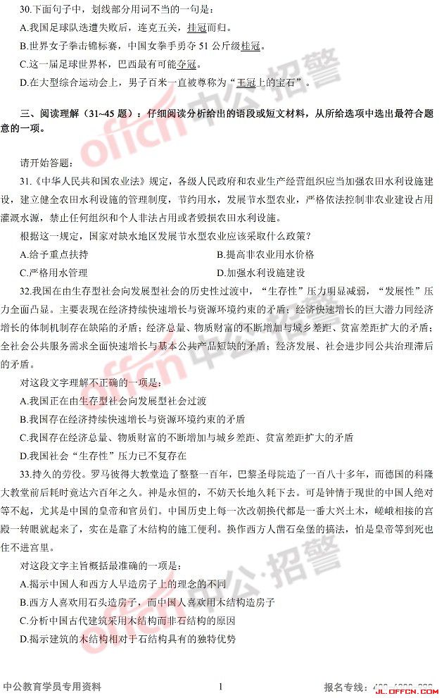 2016吉林招警考试行测模拟冲刺练习三(阅读理解)