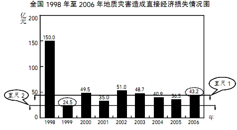 1998年至2006年期间,地质灾害造成直接经济损失额的中位数(中位数是指由大到小顺序排列居于中间位置的变量值)比损失最小年份的损失额( )。