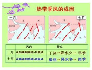 学生小组探究季风的成因。学生先分组讨论,然后抢答。