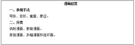 教师小结:漫画是通过夸张、变形、寓意或象征等不同表现手法来达到讽刺、歌颂、传播或娱乐目的一种艺术形式。