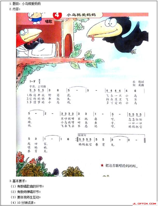 老师归纳总结:这是一首非常动人的歌曲,轻快的优美的旋律为我们展示了了小乌鸦爱妈妈,为妈妈找虫子、喂妈妈的情景,让我们一起走进小乌鸦的世界。