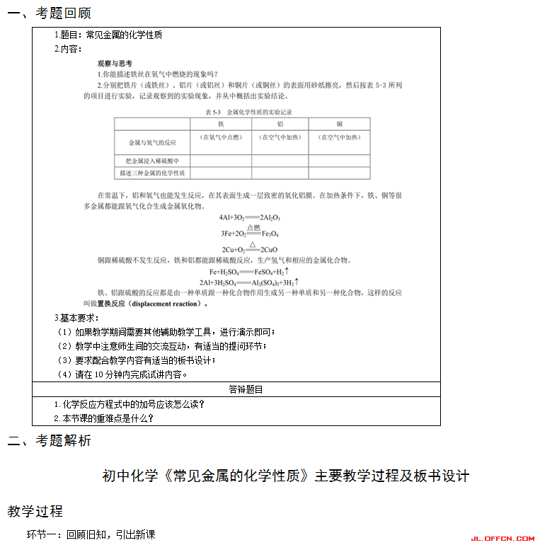 重点:金属的活动性顺序及置换反应。因为金属的活动性顺序是中学化学学习比较重要的一个规律,与后面要学习的置换反应直接相关,是将要学习的金属性、原电池正负极判断等知识的基础。