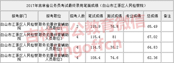 2018年吉林省公务员考试进入面试最低笔试成绩是多少?最终公务员录用笔试面试成绩是多少?吉林公务员考试分数线是多少?针对这些疑问吉林中公教育为广大考生汇总整理了2017年吉林省公务员考试最终录用笔试面试成绩信息汇总。本文为广告考生提供(白山市江源区人民检察院)2017年吉林省考最终录用笔试面试成绩。
