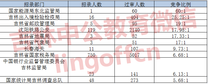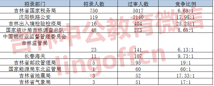截止到11月2日16时,通过审核人数前三位的部门依次是:吉林省国家税务局、沈阳铁路公安局、吉林出入境检验检疫局,三部门通过审核总人数达7561人,占通过审核总人数的90.66%。